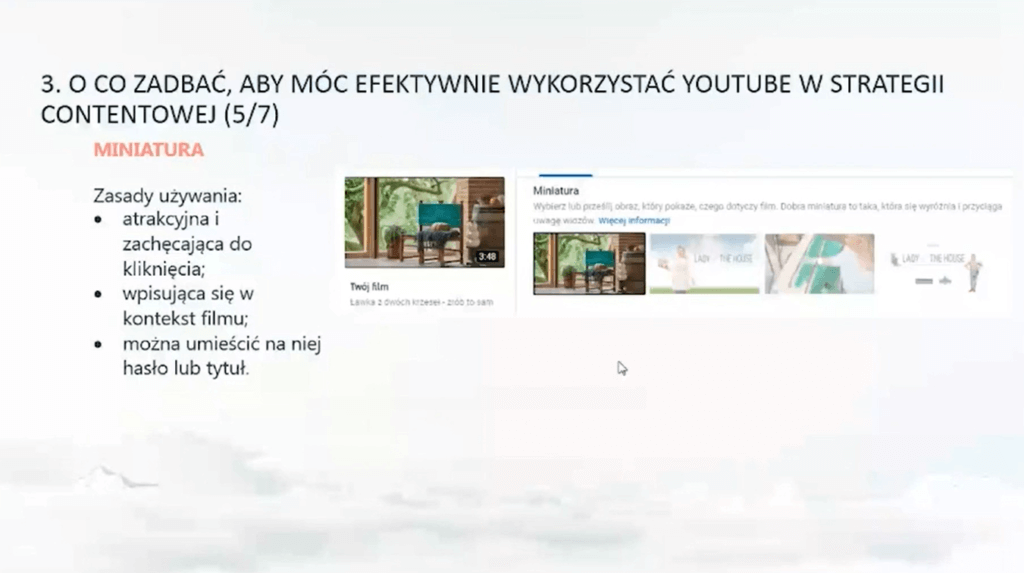 Miniatura powinna być atrakcyjna i zachęcać do kliknięcia w dany film. Nie może być to przypadkowa klatka. Jeśli tylko mamy taką możliwość warto przygotować specjalną grafikę.