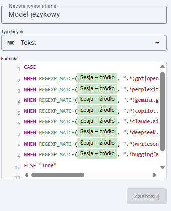 Ta reguła sprawdza, czy w nazwie źródła sesji pojawia się którakolwiek z popularnych nazw narzędzi AI. Jeśli tak – przypisuje ją do nowego wymiaru, który można nazwać np. Model językowy.