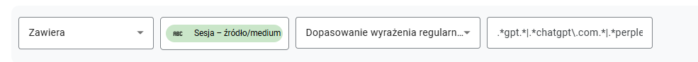 Filtr o nazwie „Ruch z AI” konfigurujemy tak, aby uwzględniał tylko sesje pasujące do poniższego wyrażenia regularnego: