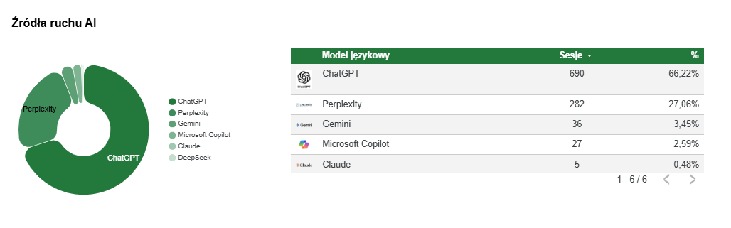 Gdy nałożymy ten filtr na tabelę lub wykres kołowy, otrzymamy przejrzysty podgląd na to, który bot AI najchętniej wysyła czytelników do witryny: