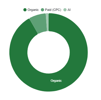 Niezwykle wartościowym wykresem jest porównanie LLM do Organic Search lub ruchu płatnego. Poprzez lekką modyfikację pola obliczeniowego można wykorzystać wykres pierścieniowy, aby zobaczyć, jaką część ruchu z wyszukiwarek stanowią już wejścia z modeli językowych.