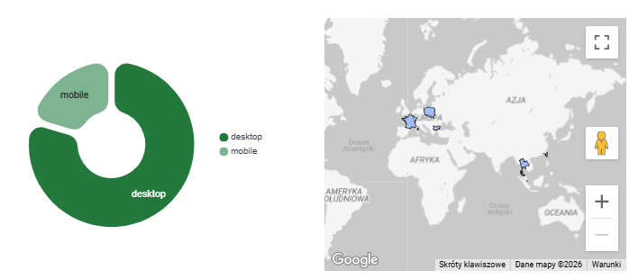 Na koniec uzupełnij raport o rozkład geograficzny oraz podział na urządzenia. Mapa świata pokaże Ci, czy Twój content buduje zasięgi globalne – narzędzia AI często tłumaczą treści w locie, więc możesz zacząć pozyskiwać ruch z rynków, o których wcześniej nawet nie myślałeś. Z kolei podział na desktop i mobile powie Ci, czy użytkownicy „rozmawiają” z botami częściej przy biurku, czy w biegu.