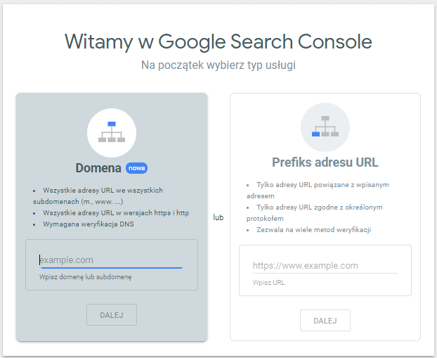 Odwiedź stronę https://search.google.com/search-console/welcome kliknij rozpocznij i zaloguj się. W Twoim przypadku posłużymy się metodą prefiksu adresu URL. Brzmi strasznie? Nic się nie martw, to naprawdę proste!