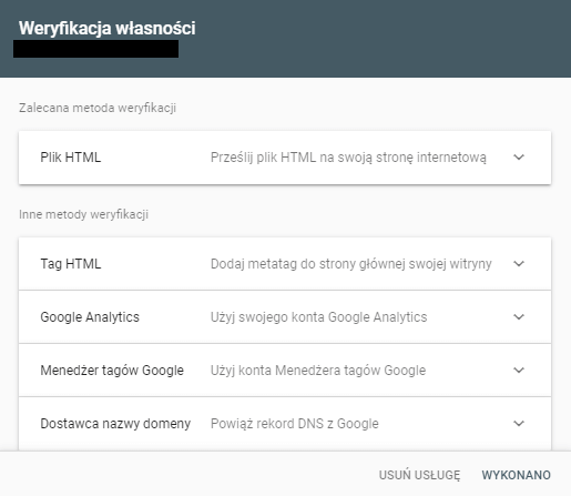 Google daje nam cztery możliwe sposoby weryfikacji za pomocą prefiksu adresu URL: