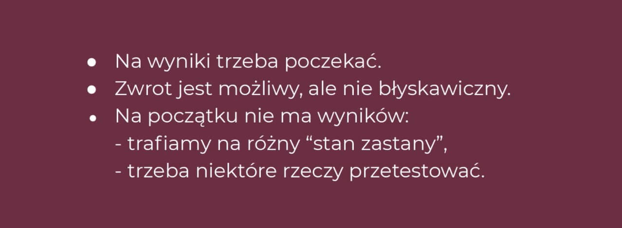 - klient był przygotowany na to, że pierwsze efekty, które przyniosą zwrot mogą wystąpić dopiero po 6 miesiącach,