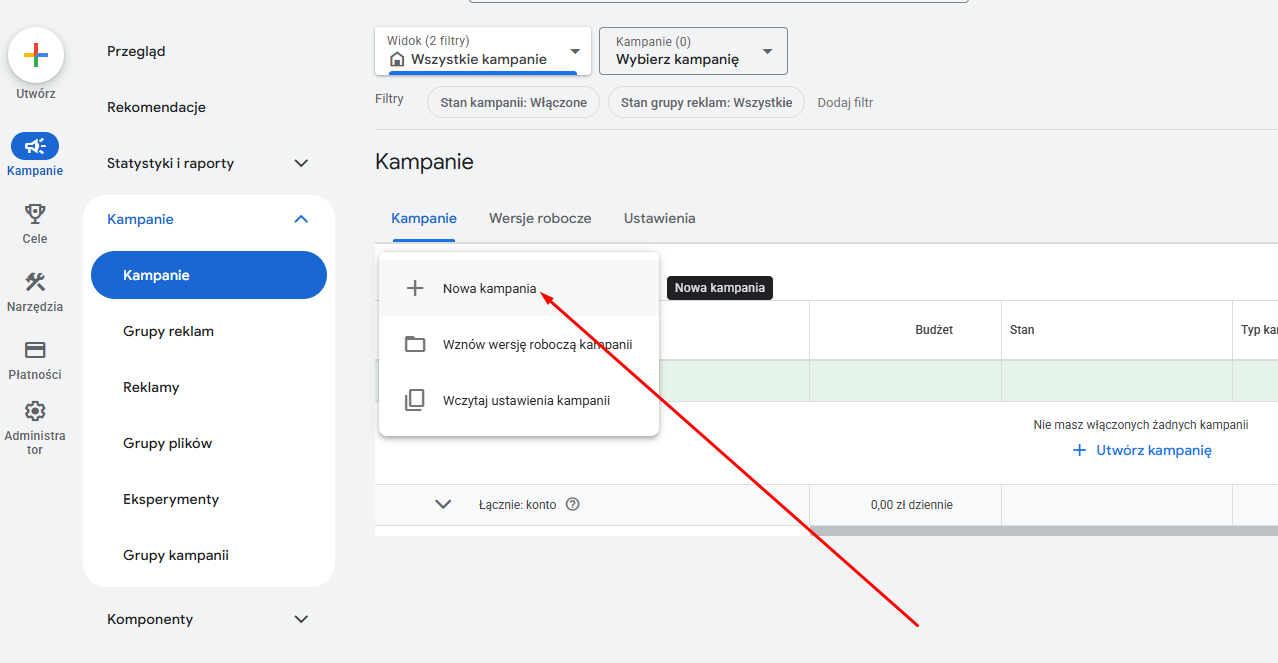 Zaloguj się do interfejsu Google Ads i kliknij przycisk dodawania kampanii „+”, a następnie wybierz „Nowa kampania”.
