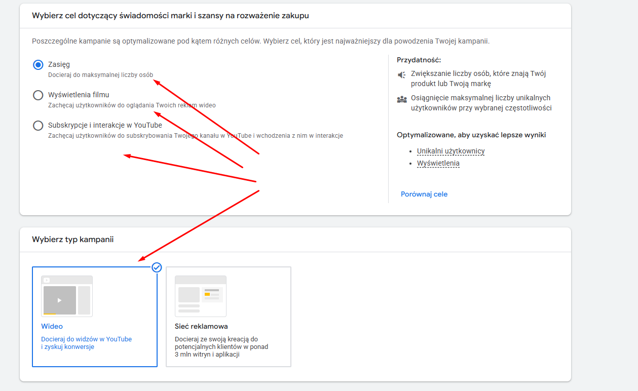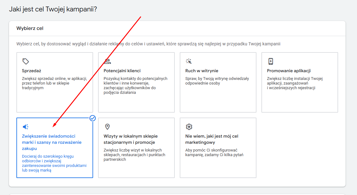 Wybierz jeden z celów dla Twojej kampanii. W przypadku:
