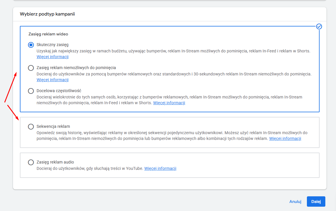 Zaznacz jeden z podtypów kampanii w zależności od tego, która z reklam In-Stream Cię interesuje, a następnie kliknij przycisk “Dalej”, aby przenieść się do panelu konfiguracji kampanii.