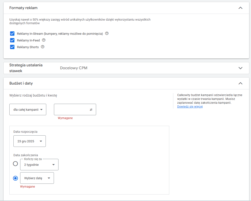 Proces ustawiania kampanii z reklamą In-Stream można podzielić na kilka kroków.
