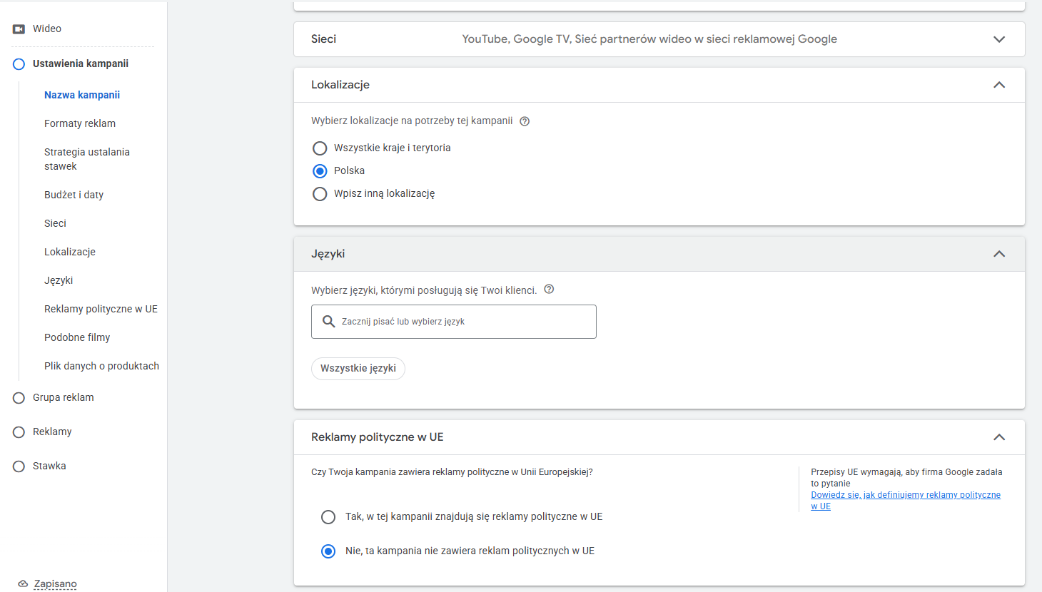- Języki – język, na który chcesz skierować swoje reklamy (wykrywany przez Google w sieci wideo na podstawie języka stron i aplikacji przeglądanych przez użytkownika).