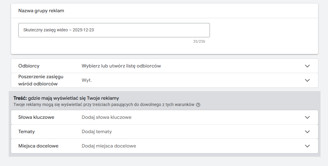 - miejsca docelowe – konkretne kanały czy filmy na YouTube lub ich grupy, witryny, aplikacje bądź ich kategorie (np. gry.interia.pl).