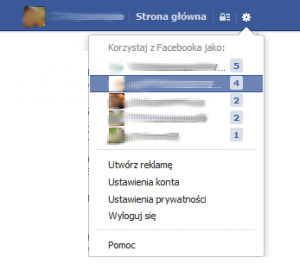 Nazwa profilu firmy na Facebooku może być zmieniona bardzo szybko. Na początek musimy przelogować się z profilu firmy, której nazwę chcemy zmienić na swój profil. Aby to zrobić, w prawym górnym rogu profilu na Facebooku wybieramy zębate kółeczko. Rozwija nam się lista taka, jak poniżej. Wybieramy profil z naszymi danymi.