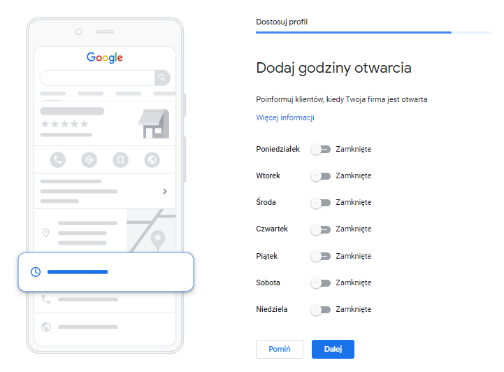 Tak jak w nagłówku, dodajmy informację kiedy firma jest otwarta. Możemy zaznaczyć, że w danym dniu w tygodniu przedsiębiorstwo jest zamknięte – np. w sobotę lub w niedzielę. W pozostałe dni tygodnia, które zaznaczymy jako otwarte mamy możliwość dodania dokładnych godzin, kiedy klienci mogą skorzystać z naszych usług. W czasie świąt lub np. sylwestra Google dało nam możliwość dodania skróconych godzin pracy albo dodania, że w dany dzień nie pracujemy.