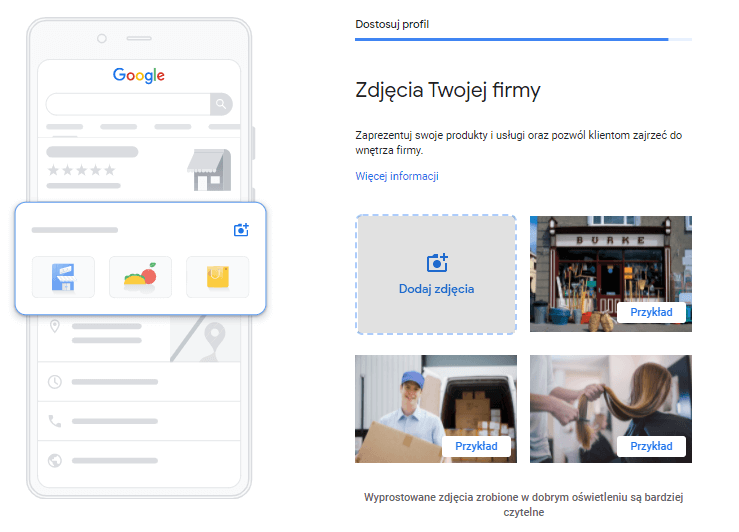 Dodajmy zdjęcia usług lub lokalu firmy. Postarajmy się, aby zdjęcia były zrobione profesjonalnie, najlepiej przez fotografa. W przypadku sklepu internetowego może być to zdjęcie naszej strony internetowej lub uporządkowanego magazynu.