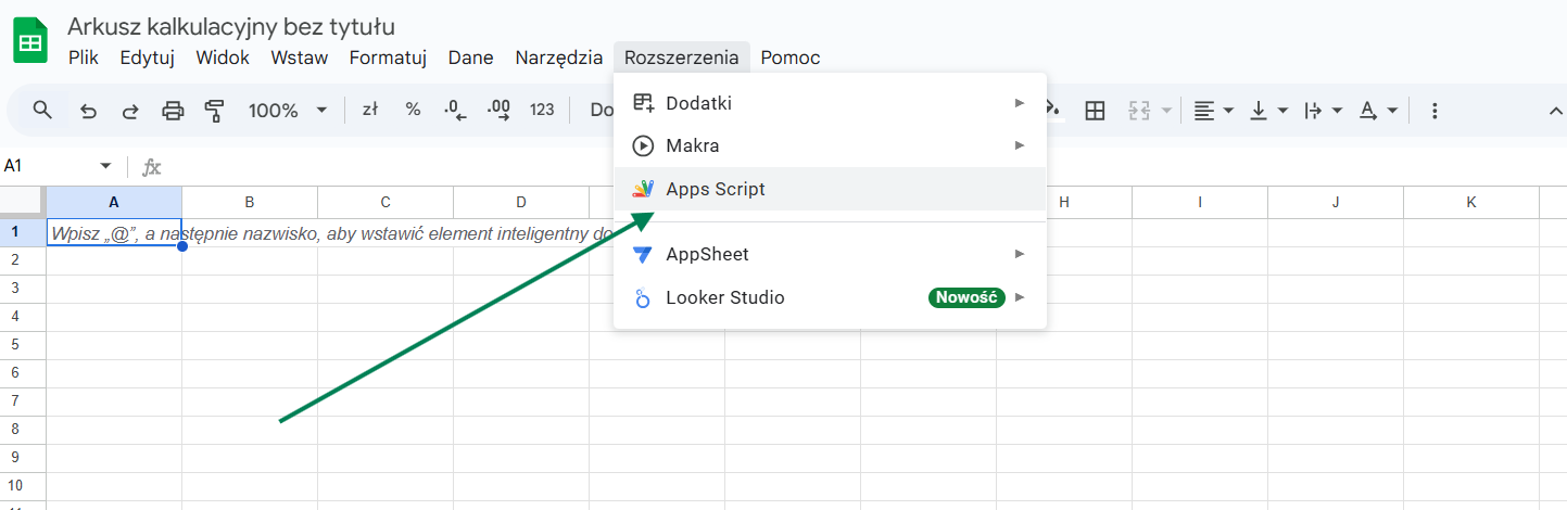 2. Kliknij „Rozszerzenia” -> „Apps Script”