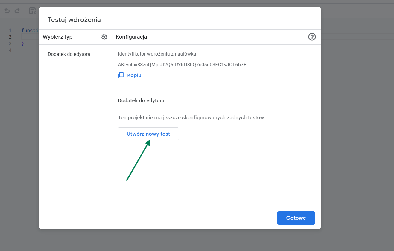 6. W prawym górnym rogu kliknij „Wdróż” i wybierz „Testuj wdrożenia”