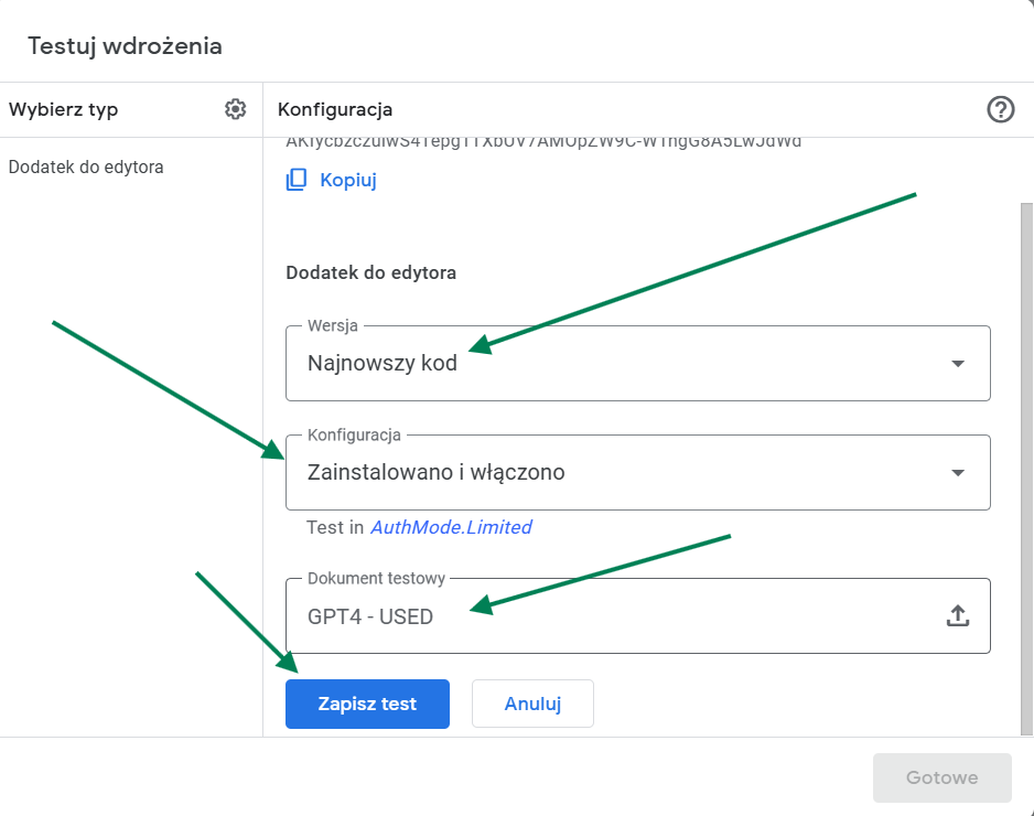 9. W ustawieniach „Dodatek edytora” wybierz „Zainstalowany i włączony” w sekcji „Konfiguracja”, a w sekcji „Dokument testowy” wybierz nowo utworzony dokument i kliknij „Zapisz test”