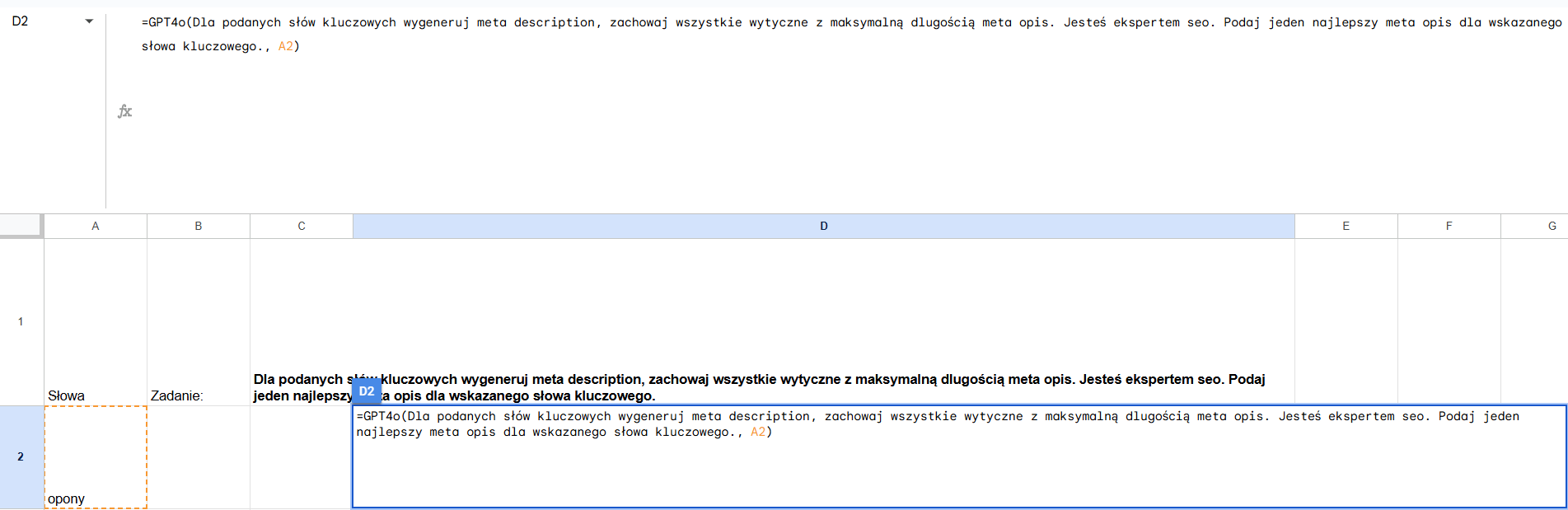Aby korzystać z modelu GPT-4o, użyj funkcji GPT4O utworzonej w kroku 3, z dwoma parametrami: zapytaniem dla A2 i wybraną komórką Arkuszy Google (np. =GPT4O(„Przeanalizuj dane i wyodrębnij tylko parzyste wyniki”, A1)) lub skorzystaj z przykładu wskazanego na zrzucie ekranu poniżej: