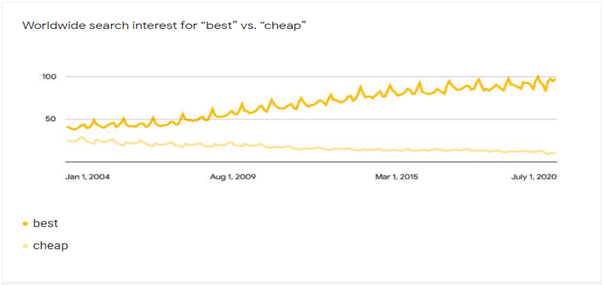 Proces zakupowy ma nieliniowy charakter. To skomplikowana sieć punktów styku, która różni się w zależności od osoby. Od razu warto powołać się na konkretny przykład. Na przestrzeni lat można zaobserwować zmiany zachowań zakupowych w wyszukiwarce Google. Przykłady fraz „best” i „cheap” zdają się ukazywać te zmiany najlepiej: