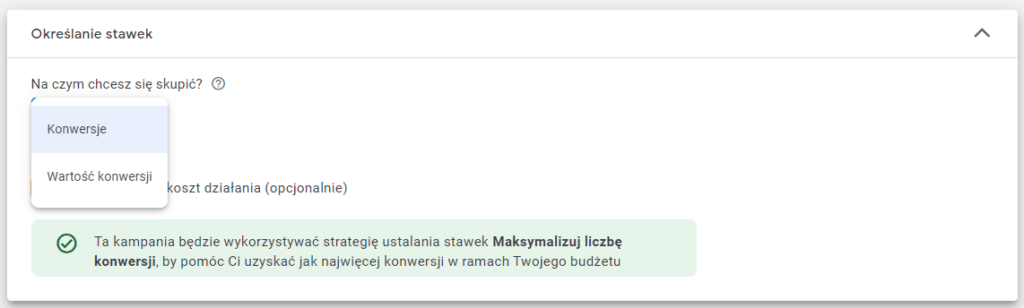 Czy zatem taka zautomatyzowana kampania oznacza, że wystarczy przesłać niezbędne materiały i czekać na ogrom konwersji? Absolutnie nie. Co więcej, Performance Max można, a właściwie trzeba optymalizować na każdym etapie. Już podczas ustawień początkowych musimy dokonać wyboru pomiędzy dwoma dostępnymi strategiami ustalania stawek: