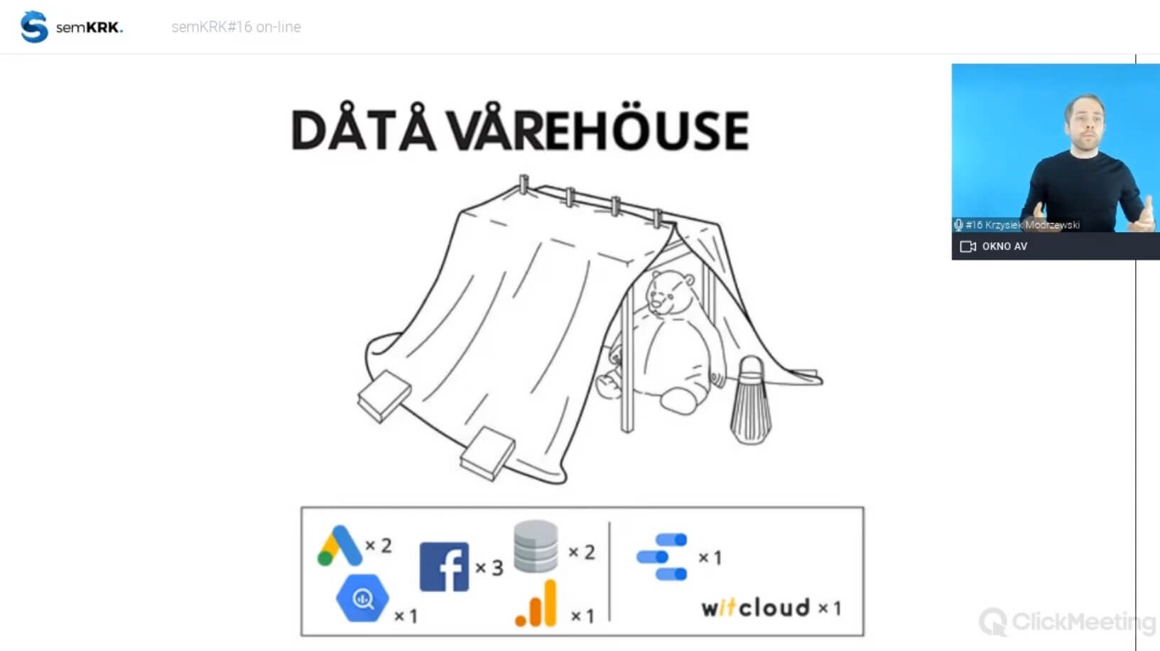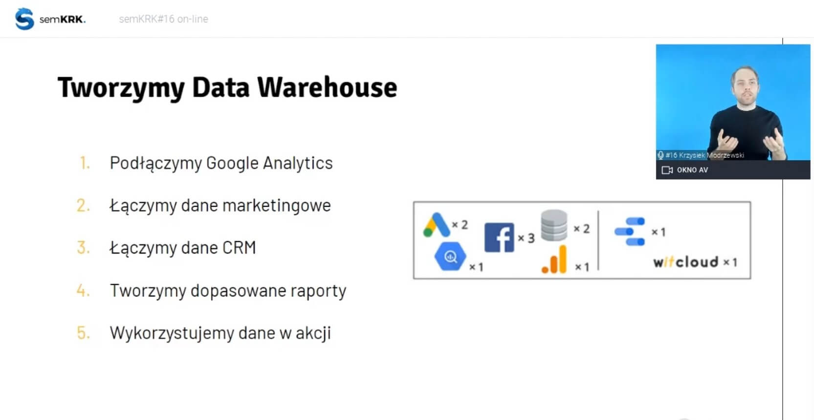 Krzysztof Modrzewski wystąpił na semKRK#16 on-line z prelekcją Data Warehouse for Dummies – Case study. Z reklamą cyfrową i analityką internetową Krzysztof związany jest od 2010 roku. Prowadził zajęcia dla Google Partners Academy, SEMcamp University i Marketing Masters, Google Growth i Startup School. Na co dzień rozwiązuje problemy analityki internetowej i mediów firm dynamicznie rozwijających się w internecie. Jeden z twórców narzędzia WitCloud.