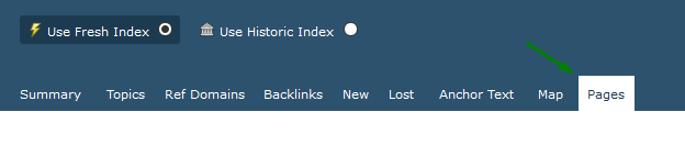 2) Przejdź do zakładki Pages, gdzie uzyskasz najcenniejsze podstrony danego serwisu pod kątem backlinków. Możesz na tym etapie wybrać wskaźniki, według których dobierzesz podstronę, której profil linkowy będzie bazą do dalszego outreachu. Może to być po prostu ilość linków, ale także np. Trust Flow lub liczba domen linkujących. Możesz pominąć ten punkt, jeśli masz obrany konkretny landing page, który będzie źródłem do pozyskania danych.