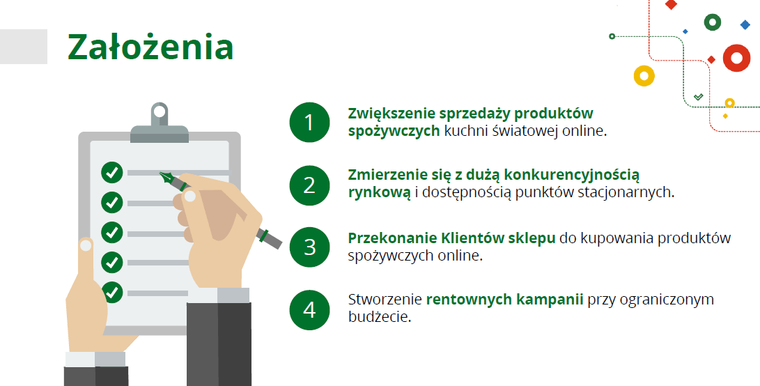 Ogólnym celem biznesowym dla Klienta było zachęcenie do skorzystania z ofert znajdujących się tam restauracji oraz zachęcenie osób do odwiedzenia samego miejsca. Dodatkowym działaniem było uzyskanie konwersji z leadami od osób zainteresowanych wynajmem Lokalu 13, przy bardzo niskim budżecie kampanii oraz dużej konkurencji takich ofert w Warszawie.