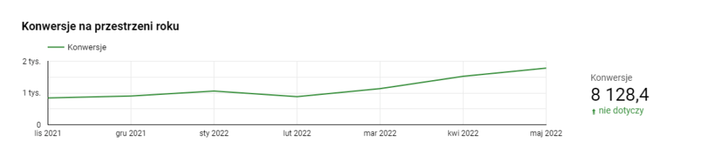 Jesteśmy szczególnie dumni z tego, że nasz koszt CPC jest niski przez całą kampanię. Osiąganie imponujących liczb poprzez podnoszenie budżetu to kusząca opcja, ale udało nam się to zrobić przy minimalnym nakładzie finansowym ze strony Klienta– lokalna kampania utrzymuje CPC na rekordowym poziomie 0,08 zł przy współczynniku konwersji 2%. Choć kampania koncentrowała się na pozyskiwaniu leadów, ponad milion wyświetleń reklamy wpłynęło na popularność biznesu Klienta. Zauważyliśmy sześciokrotny wzrost zapytań związanych z marką. Słowa kluczowe związane z marką również zanotowały wzrost – o 417% r/r (1900 wyszukiwań we wrześniu 2021 r. / 12 tys. wyszukiwań w maju 2022 r.).