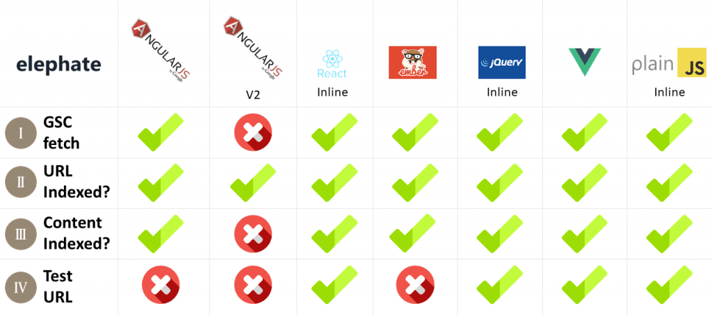 Kolejna zmienna która nie pozwala nam jednoznacznie powiedzieć czy treść będzie zaindeksowana jest framework z którego korzystamy. Poniżej przegląd tego jak Google traktuje elementy ładowane za pomocą JavaScriptu