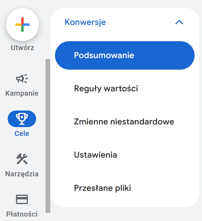 1. Zaloguj się na konto Google Ads i przejdź do sekcji „Cele” (Goals).