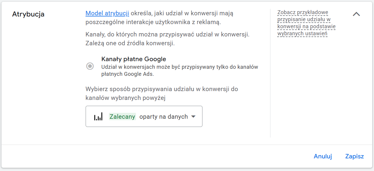 5. W sekcji „Model atrybucji” zobaczysz opcje dostępne w Google Ads. Wybierz „Oparty na danych” (jeśli aktywny) lub „Ostatnie kliknięcie”.