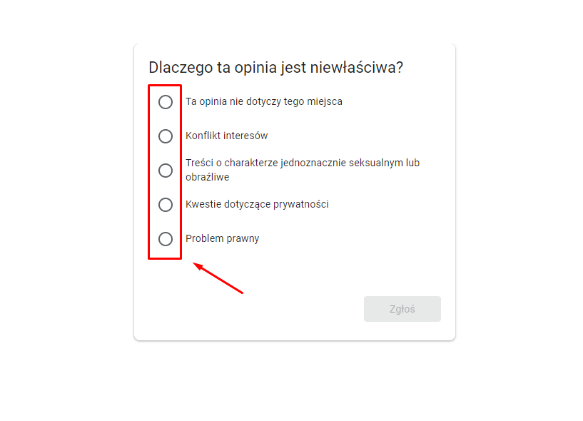 Mamy wtedy możliwość wyboru powodu zgłoszenia i przesłania konkretnego przypadku do weryfikacji Google.