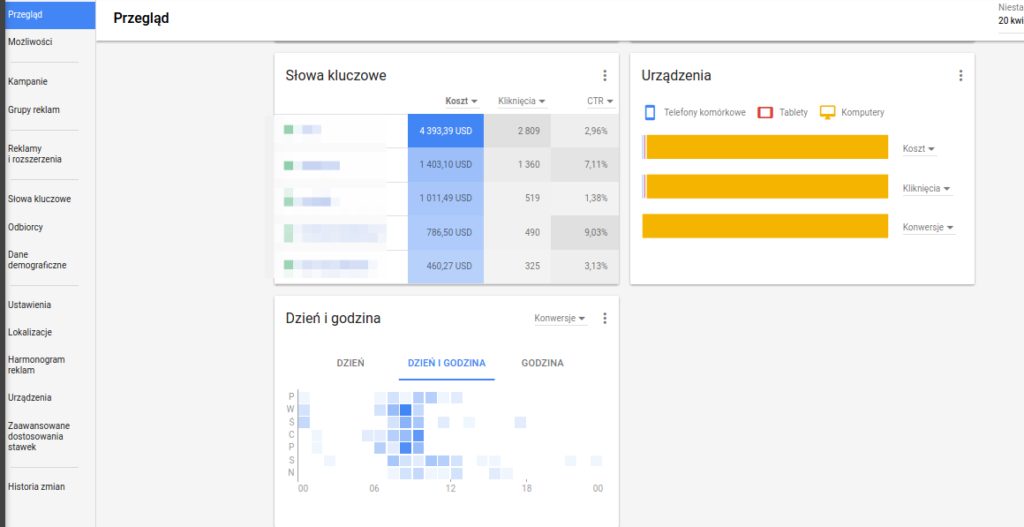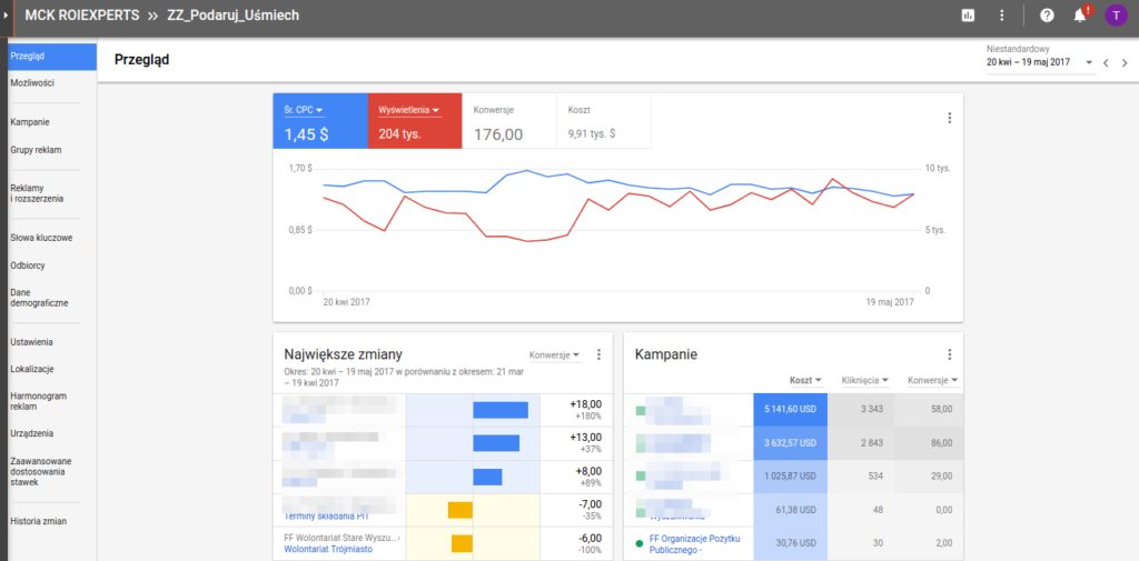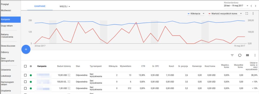 Świetnie wygląda wizualizacja danych po wejściu w kampanie czy grupy reklam. Wykresy są naprawdę świetnie zaprojektowane, można je powiększyć, porównać w okresach czasowych, zmienić zakres. Dodatkowo wszystko działa bardzo szybko i interaktywnie. Duże usprawnienie w porównaniu ze starym interfejsem.