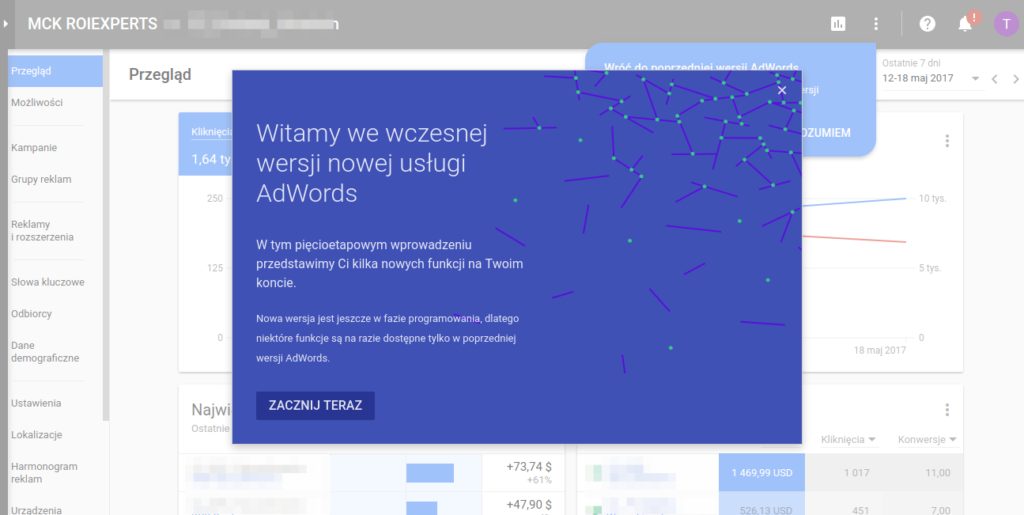 Po drodze była cała masa małych zmian, zmianek i zmianeczek, które były doklejane sukcesywnie, w różne miejsca. Czasem, żeby znaleźć coś potrzebnego trzeba było się dobrze zastanowić, gdzie zostało to doklejone. W ubiegłym roku to podczas konferencji w USA, na której pokazywane były zmiany nadchodzące w AdWords zaprezentowane zostały pierwsze screeny z nowego interfejsu. W sieci zawrzało – i słusznie, bo nowy design to istna rewolucja. Pokażmy na paru zrzutach z ekranu zobaczmy, co tak naprawdę się zmieniło.