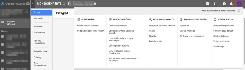 Klikając na strzałkę, możemy zobaczyć wszystkie kampanie które mamy na koncie i wybrać zakres żeby zawęzić daną pozycję w menu (np. słowa kluczowe, reklamy) tylko do danej kampanii. Innymi słowy możemy wybrać sobie kampanie i zaznaczyć opcję np. możliwości lub przegląd czy historię zmian. Zawęzi nam dane do wybranej kampanii. Wcześniej ta opcja była możliwa dla niektórych elementów kampanii teraz przeglądanie ustawień czy historii jest dużo łatwiejsze.