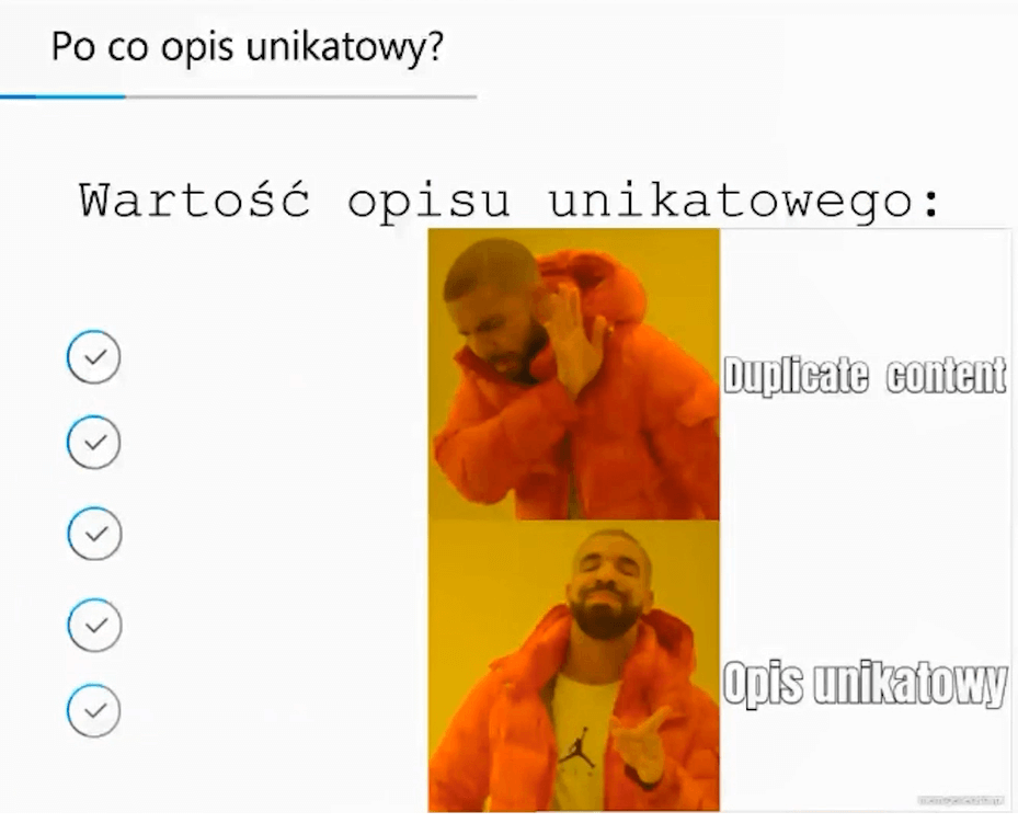 Co myślisz o powielaniu kontentu na kartach produktów? Przykładowo informacje o cechach materiału wykonania, który dla wszystkich produktów na sklepie jest taki sam.