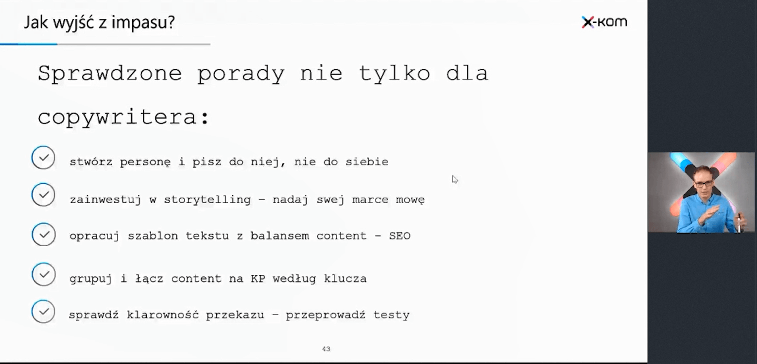 Od siebie dodam jeszcze, że warto przeprowadzać testy. Regularnie prosić o feedback, czy pisane treści są wartościowe, zrozumiałe, angażujące.