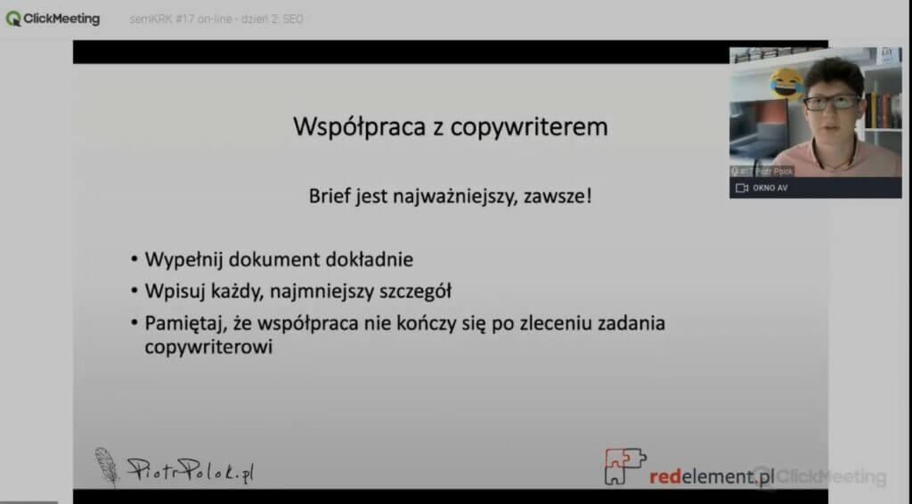 Wspomniałem w prezentacji, że copywriter coraz bardziej upodabnia się do dziennikarza i już teraz widzę sporo tych samych zadań czy obowiązków. Wszystko zależy od etapu, na jakim jest copywriter, jednak gdybym miał wskazać najważniejsze umiejętności dziś to na pewno:
