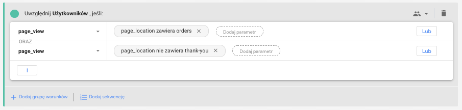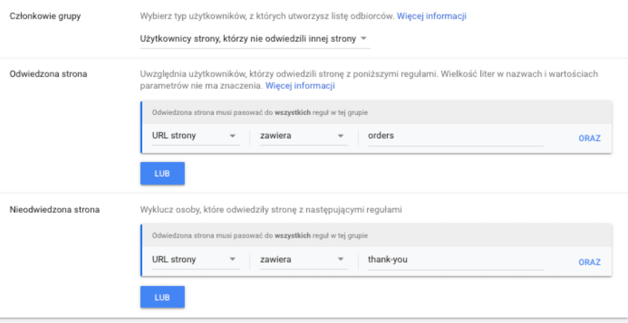 Tworzymy listy remarketingowe użytkowników, którzy przykładowo odwiedzili podstronę koszyka, zdecydowali się także na uzupełnienie danych, dokonali zamówienia, ale nie trafili na stronę podziękowania. Oczywiście warto też stworzyć listę użytkowników, którzy jedynie dodali produkty do koszyka. Tutaj warto stworzyć wiele list remarketingowych. Dzięki temu można dostosować działania marketingowe do wniosków, które wyciągamy z analityki.