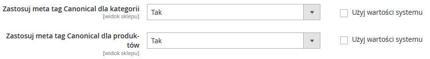 - Zastosuj meta tag Canonical dla produktów -> „TAK”