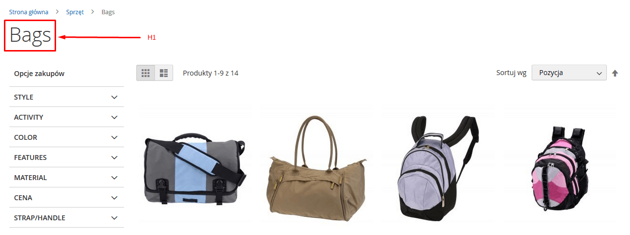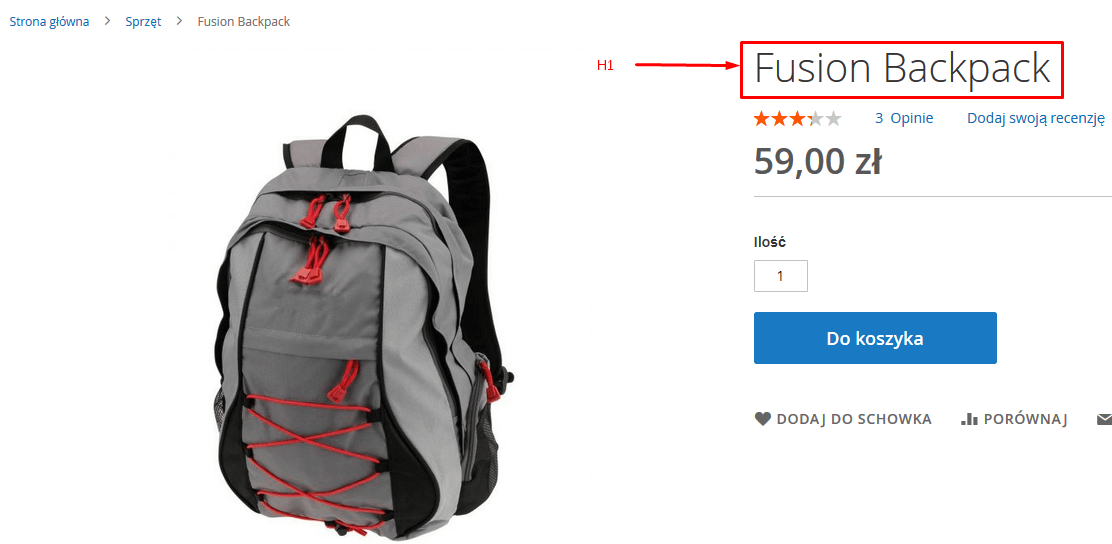 Domyślnie w Magento 2 nagłówki H1 przypisywane są prawidłowo nazwom produktów i kategorii.