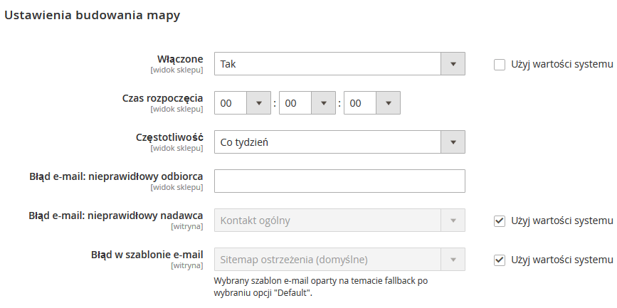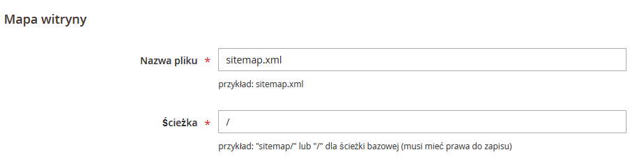 Po zakończeniu konfigurowania mapy strony należy ją wygenerować w sekcji MARKETING -> SEO i wyszukiwanie -> Mapa witryny. Standardowa nazwa pliku dla mapy to sitemap.xml, w ścieżce wystarczy wpisać znak trailing slasha.