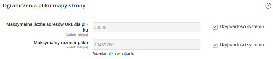Kolejna sekcja to „Ograniczenia pliku mapy strony„, gdzie możemy skonfigurować maksymalną liczbę adresów URL dla pliku mapy i jego maksymalny rozmiar w MB. Zgodnie z rekomendacjami Google plik mapy nie powinien zawierać więcej niż 50 tys. URL-i i przekraczać rozmiaru 50 MB.