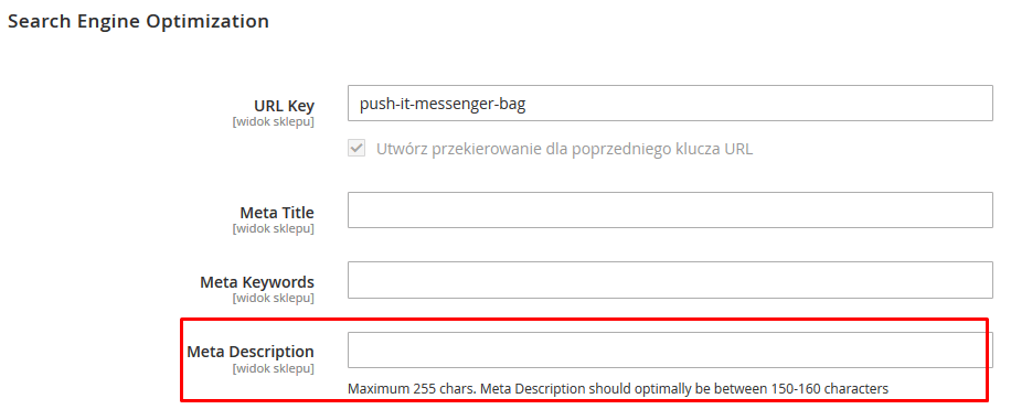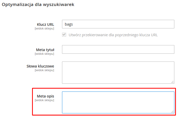 Magento oferuje możliwość edycji meta opisu z poziomu edycji danego produktu, kategorii bądź statycznej strony. Uwaga! Pozostawienie pustego pola z meta opisem w przypadku kategorii spowoduje całkowite usunięcie znacznika meta description z kodu źródłowego sklepu. W takim przypadku wyszukiwarka pobierze dowolną treść znajdującą się na stronie danej kategorii i wyświetli ją w wynikach wyszukiwania (SERP). Brak dodanego meta opisu na karcie produktowej spowoduje natomiast jego zaciągnięcie z treści opisu produktu.
