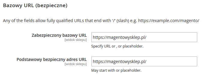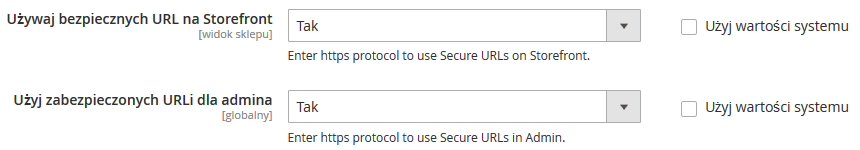 Warto również włączyć SSL dla front-endu sklepu, aby był otwierany przez https, zaznaczając opcję „Używaj bezpiecznych URL na Storefront” na „TAK”. Aby panel administratora również był chroniony protokołem SSL, należy ustawić opcję „Użyj zabezpieczonych URLi dla admina” na „TAK”.