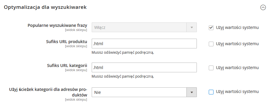 Magento 2 zawiera wsparcie dla przyjaznych adresów URL, które można ustawić z poziomu panelu administratora w sekcji SKLEPY -> Konfiguracja -> Katalog -> Katalog -> Optymalizacja dla wyszukiwarek. Znajdują się tam 2 pola odpowiedzialne za przyjazne adresy URL: Sufiks URL produktu i Sufiks URL kategorii. Zaleca się usunięcie ich zawartości, ponieważ sufiksy w postaci rozszerzenia .html nie mają żadnego pozytywnego wpływu na SEO, a jedynie niepotrzebnie wydłużają adresy URL. Zmianę tę warto wdrożyć jedynie w przypadku, gdy dopiero zaczynasz konfigurować swój sklep. W przeciwnym razie po usunięciu sufiksu konieczne będzie ustawienie przekierowań 301 ze starych adresów na nowe. Warto również zmienić opcję „Użyj ścieżek kategorii dla produktów” na „NIE”, aby nie wydłużać i tak zwykle długich już URL-i kart produktowych.