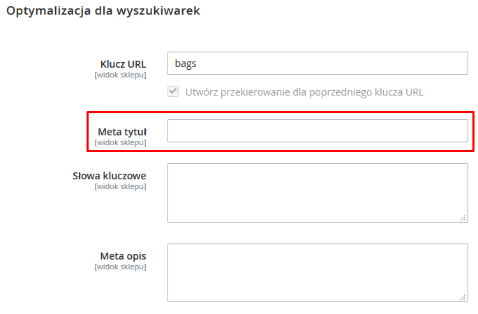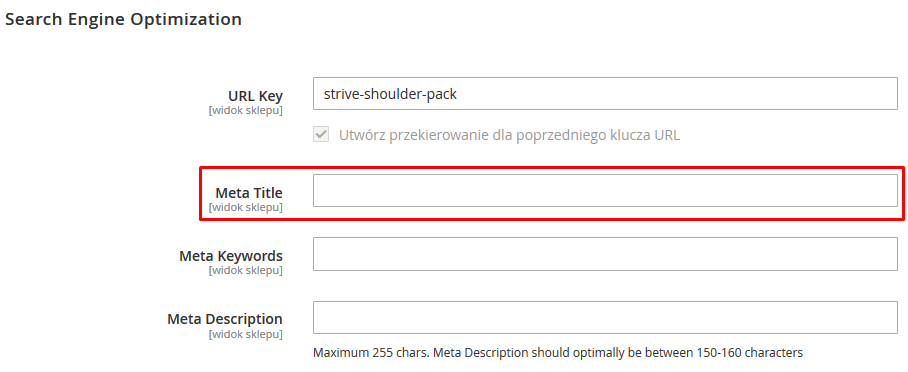 Meta tytuły można również modyfikować bezpośrednio w edycji danego produktu lub kategorii w sekcji „Search Engine Optimization” (optymalizacja dla wyszukiwarek).