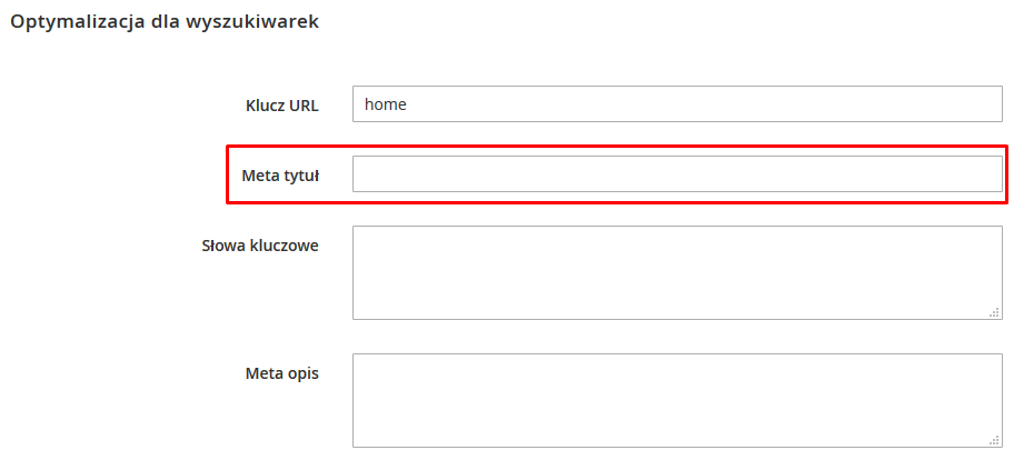 Meta tytuł dla strony głównej i innych statycznych stron zmieniamy w sekcji ZAWARTOŚĆ -> Elementy -> Strony -> Optymalizacja dla wyszukiwarek.