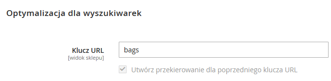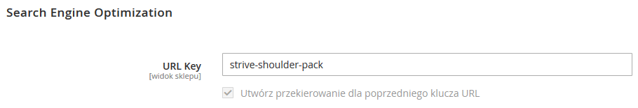 Przyjazne adresy URL można również modyfikować w sklepie na platformie Magento bezpośrednio w edycji danego produktu lub kategorii w sekcji „Search Engine Optimization” (optymalizacja dla wyszukiwarek), w polach „URL Key” / „Klucz URL”.