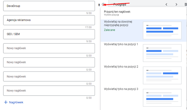 Ten typ pozwala na stworzenie reklamy składającej się z samych nagłówków oraz tekstów reklamowych. Maksymalnie możemy dodać 15 nagłówków (do 30 znaków) oraz 4 teksty reklamowe (do 90 znaków). Podczas tworzenia tego typu reklamy możesz również przypiąć część zasobów i ustalić, na której pozycji Twojej reklamy będą się one wyświetlać. Żeby wybrać przypiętą pozycję należy kliknąć w szarą pinezkę obok nagłówka bądź tekstu reklamy i ustalić, które miejsce dany tekst ma zajmować. Jeżeli jakiś nagłówek nie będzie przypięty, system może wyświetlić go na dowolnej pozycji w reklamie. Co ważne, przypinanie nagłówków może przekładać się na niższą ocenę, jaką wyświetla panel reklamowy oraz w zakładce „rekomendacje” może pojawić się wskazówka, żeby odpiąć podpięte nagłówki.